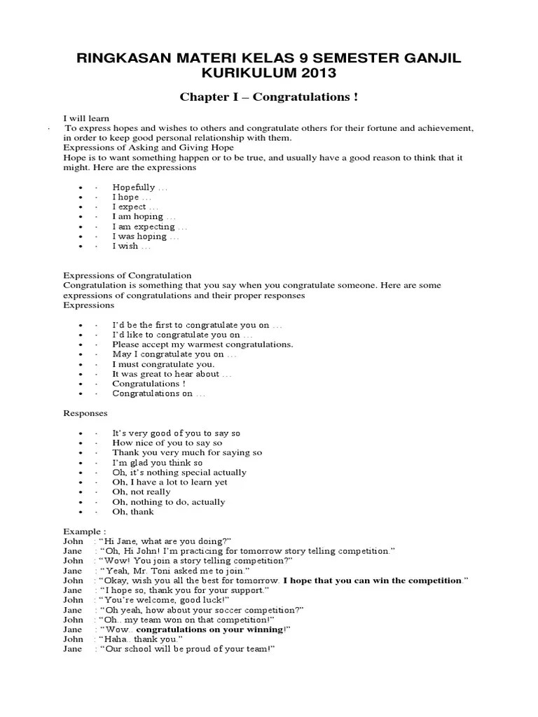 Media ajar bahasa inggris smpn 22 bekasi · beranda · absensi · absensi kelas 7. Materi bahasa inggris kelas 9 congratulation,hope,wish dan soal latihan. Congratulation, hope dan wish merupakan materi bahasa inggris kelas 9 smp semester 1 chapter 1. Berikut cara menggunakan dan mengekspresikan ucapan selamat (congratulation), harapan (hope) dan doa (wish) dalam bahasa inggris. To express hopes and wishes to others, and. Haii┏(^0^)┛ ini catatan bahasa inggris kelas 9 bab congratulation,hope,and wish (◍•ᴗ•◍)✧*。 jangan lupa like and share! Kelas 9 · chapter 1 · congratulation · wish and hope. Materi pelajaran bahasa inggris kelas ix (daring). Untuk memahami lebih lanjut tentang materi diatas, selanjutnya silahkan. Materi kelas 9 expression of hope, materi kelas 9 wish, materi kelas 9 congratulation, bahasa inggris kelas 9. To congratulate others on their fortunes and achievements, in order to keep a good personal . I hope you win the first prize in the school's competition. Materi congratulations hope & wish.